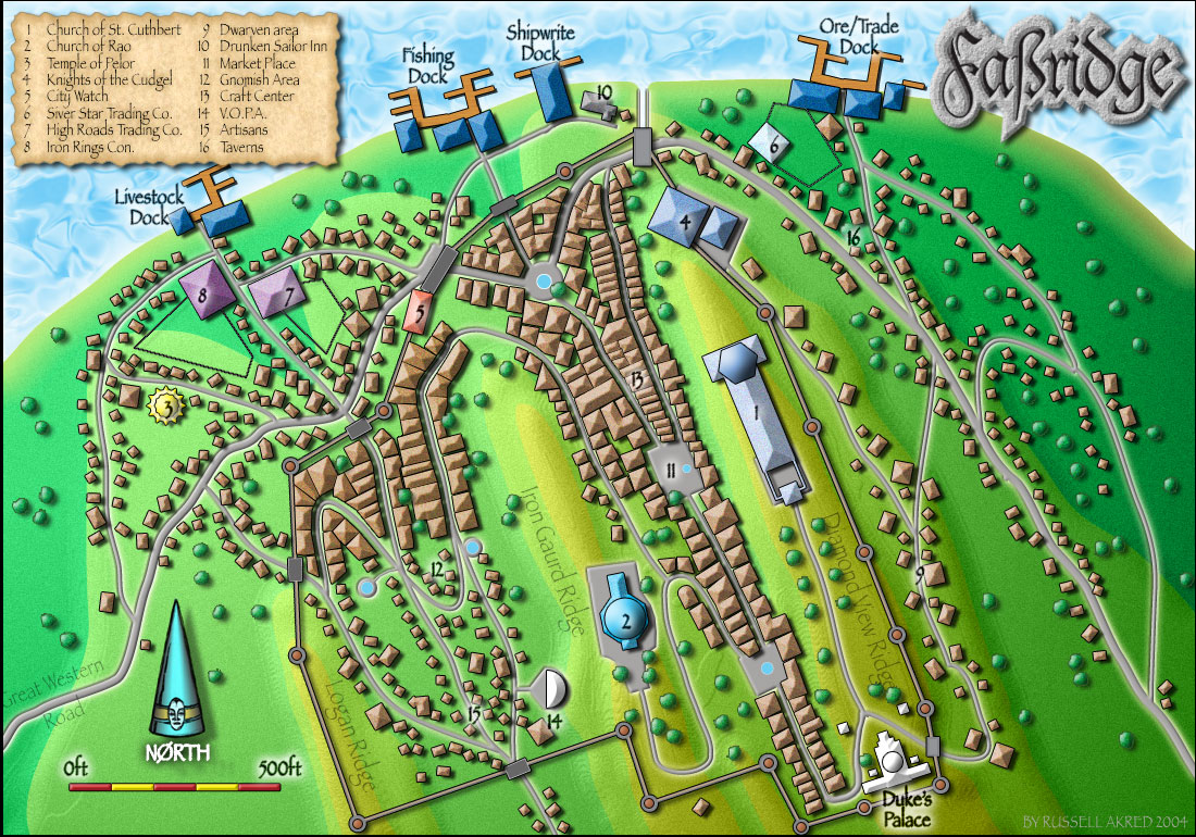Falsridge is Veluna's gateway to the west. Built on what was the original border of Veluna years ago, it has grown into a thriving city and major mercantile center. The entire city is surrounded by a 25-foot stone wall which is patrolled regularly. All races and nationalities can be found milling around this city. Almost any type of item may be found here and for the right price – almost any illegal one as well. The Knights of the Cudgel are based out of Falsridge, and houses the largest church devoted to St. Cuthbert in Veluna as well. Falsridge has many churches not found elsewhere in Veluna due to the amount of travelers coming through the city gates. The Duke runs a very tight ship here and crime is very low, but not unheard of.