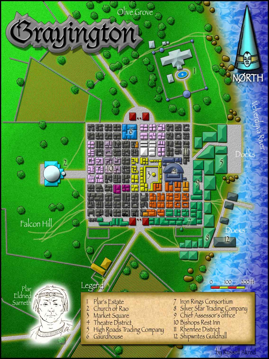 The noble house of Sarneth rules from this town. Grayington is a rather plain town. All the buildings are in neat rows and it is very clean. The town has very few taverns or bars and those it does have are very upstanding establishments. It has what most consider a very overly protective police force. Patrols are frequent and few people are seen on the streets at night. Strangers moving about at night are quickly escorted to their rooms if they have them or to the jail.