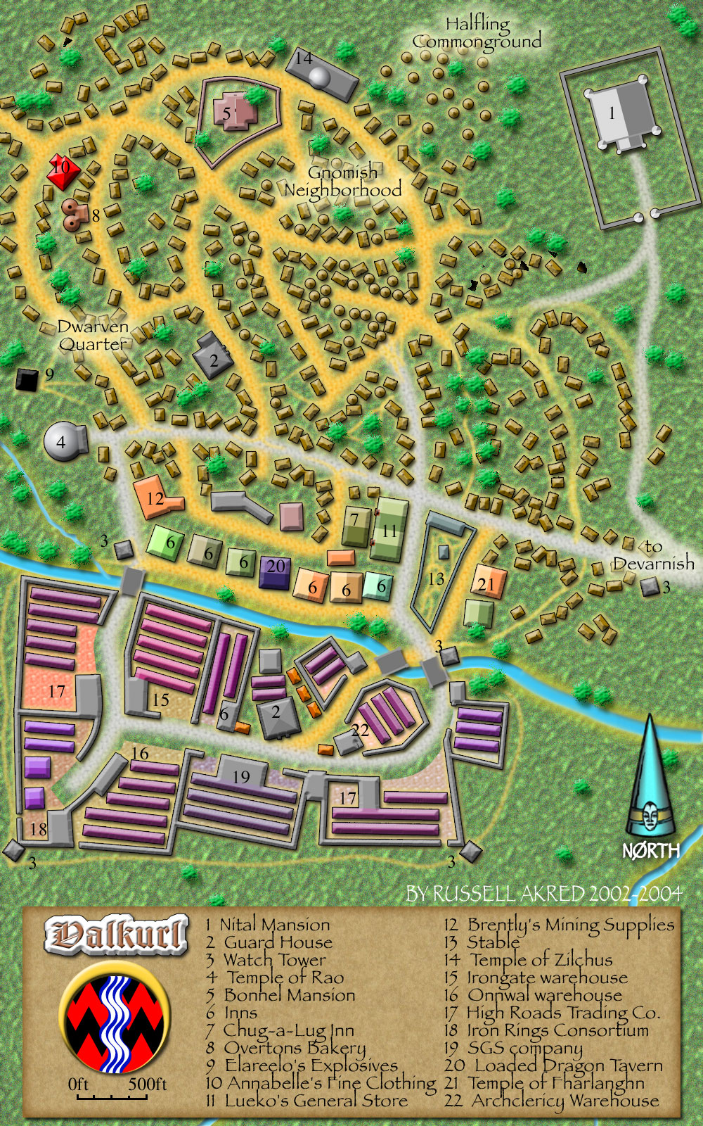 Valkurl is unlike most towns in Veluna. Half the town is warehouses and loading areas. The other half is bars, taverns, and large boarding houses. It started as a stopping point for caravans heading to Devarnish and the rest of the town grew up around it. Valkurl is known for having a bar on every corner and a guardsman on every other. The Baron runs a very tight ship in Valkurl and the crime rate here is very low. Some say its due to an agreement with the local thieves organization, but they are quickly told to stop blaming ghosts and give credit where credit is due.