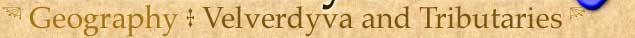 The Velverdyva meets the Fals river on a vast flood plain. The Velverdyva River, often called the Velva, has clear blue waters when they meet. The two currents slowly turn a light sepia in the winter or deep green in the summer by the time they cross under the Peace Bridge to Furyondy. By now the barges are often filled with autumn's harvest of grain, vegetables or livestock. It is always busy with full keelboats running down the center of the vast river and being pushed empty up the sides. The Rhennee work these waters well past Nyr Dyv and onto Selintan River and the great City of Greyhawk. The trip to Greyhawk from Mitrik by river can take from three to six weeks with the slow trip back up the river taking three times that long. Diocese act against much of the piracy reported trying to keep the merchants and travelers safe. Alongside Whitehale and Grayington the river is quiet yet powerful running along rich farmlands centuries old. Fewer stone watchtowers can be seen than ample tributaries from the highlands before entering the Dapple Woods. Through the peaceful Dapple Woods the river goes from areas that are almost still to areas so swift that can scare the daylights out of seasoned travelers. The Devarnish town of Jarl is the point where the Great Western Road meets the river. From here the river is much calmer making it the trade path where everything imaginable can be seen shipping up and down its waters. The Velverdyva takes it's time traversing the Iron Woods and past Verbobonc, Gnarley Forest and Dyvers before emptying into the Nyr Dyv.