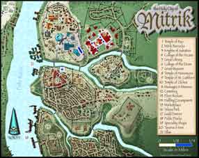 Mitrik is a very old city and shows it. The entire city is almost totally constructed of stone. When walking through its streets you get the feeling of ancient power and the worn roads show the path that thousands have walked over the past 5 centuries. The city is divided into several wards. Large stone walls separate each section with gates controlling the flow of traffic. All sections of the city are open to anybody except the temple grounds themselves which are open to authorized members and their guests only. The dock area is very clean and orderly compared to most other cities. It is well patrolled and trouble is not common. Just up the river from the dock area you can see the floating villas of some of the merchant lords of the city rising and falling with the seasonal floods.